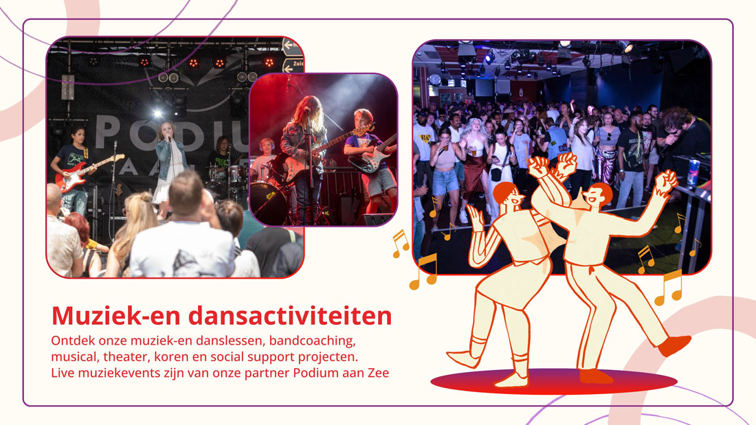 De groepslessen bestaan uit 3 periodes van 12 lessen en worden gevolgd voor muziek bij de YMCA, Keizerstraat 58 en voor dans Westduinweg 214..De periodes zijn als volgt: